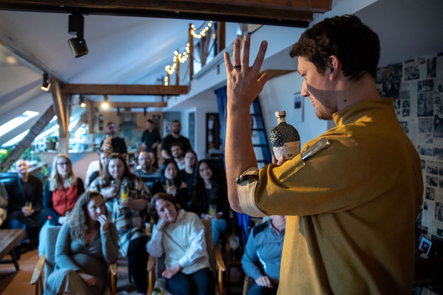 Profesionální barman s vypravěčem vás provedou večerem, kde se fantazie mísí s chutí a atmosféra ožívá s každým douškem.